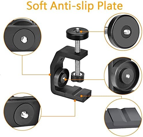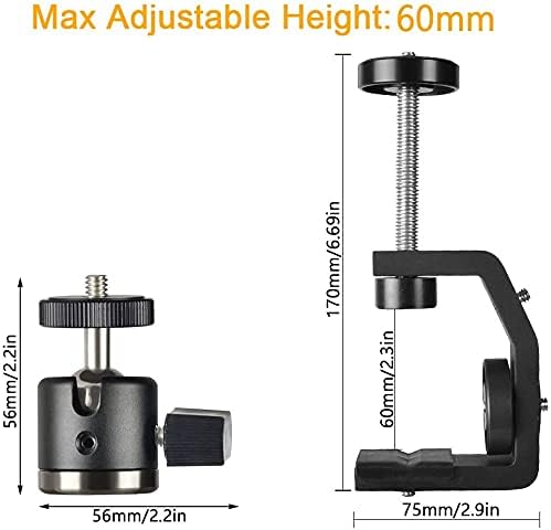 Camera C Clamp: With anti-slip soft plate, it can prevent scratches from camera; Maximum height: 60mm, it can be equipped on camera stand, tubes, lamp tripod with a diameter under 60mm free.
