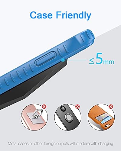 ▶【Safe Charging Protection】- CE, RoHS, FCC certified. Featuring over charging and over temperature protection never overcharges your battery or wastes energy. With four anti-slip rubber feet at the bottom to ensure stability. (Supports most phone cases not thicker than 5mm such as armor case, rubber case, hybrid case, plastic/TPU/PC cases.) PLEASE REMOVE ALL METAL AND MAGNETIC ATTACHMENT OR CREDIT CARDS BEFORE PLACING YOUR PHONE.