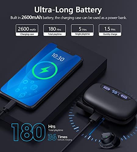 【180H Long Playtime & LED Display】:A single charge gives you a full 5 hours of listening, while the charging case extends that to 180 hours.The LED display on wireless headphone accurately display the remaining power of earbuds and charging case. Besides, charging case can be used as a power bank to charge your phone in an emergency.