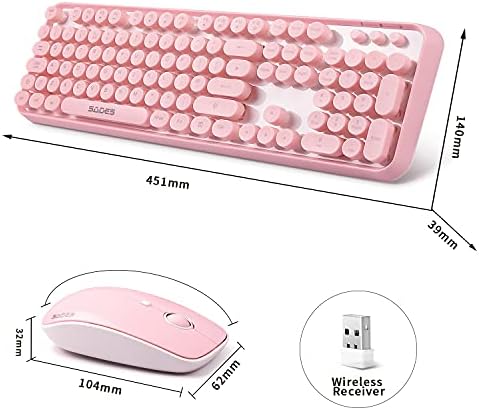 【Retro Typewriter Style】The inspiration of these full size round key cute keyboard comes from vintage typewriters offering you visual enjoyment and retro feeling to type. The mini Optical wireless mouse is with modern ergonomic design, DPI adjustable(800-1200-1600). The pink keyboard and mouse will bring you a nostalgic feeling with the eye-catching retro aesthetic.