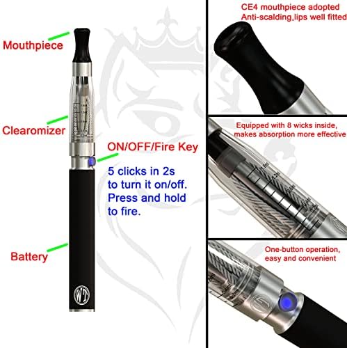 Rechargeable 1100mAh Battery, Gold – plated copper contact pin improves the power efficiency, satisfying you with long last vaping experience; 1.6ml CE4 atomizer with upgraded leak protection – Double Silicone rings at bottom, suitable for e-liquid 0-18mg(not included).